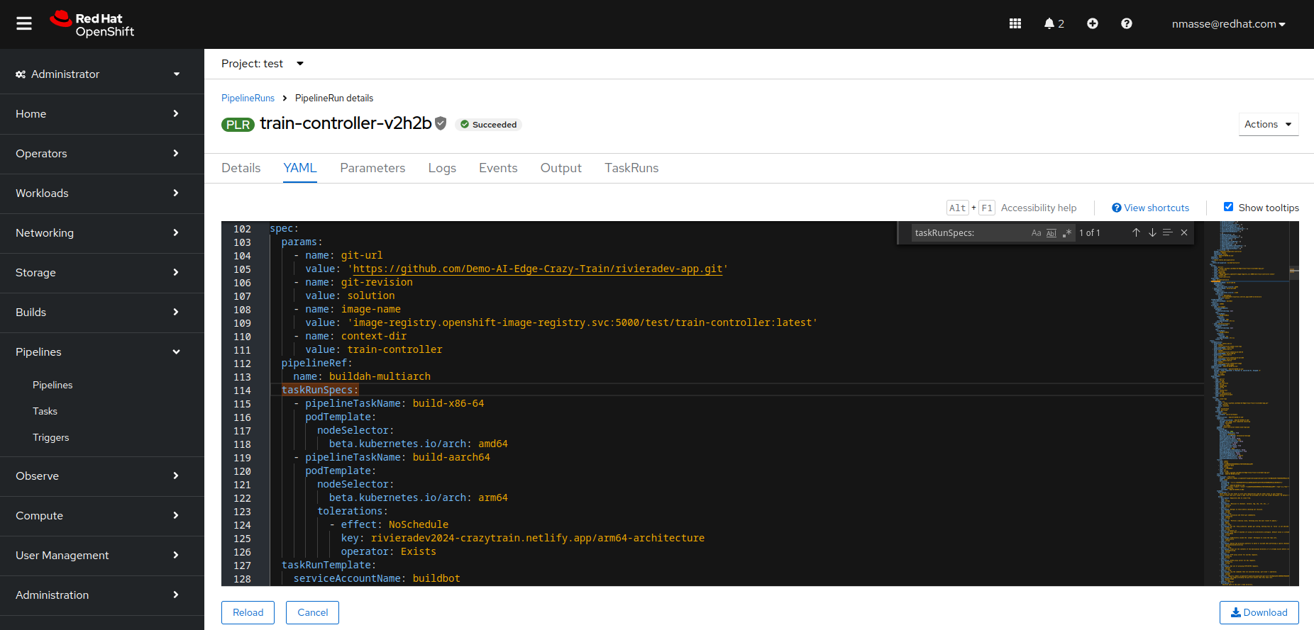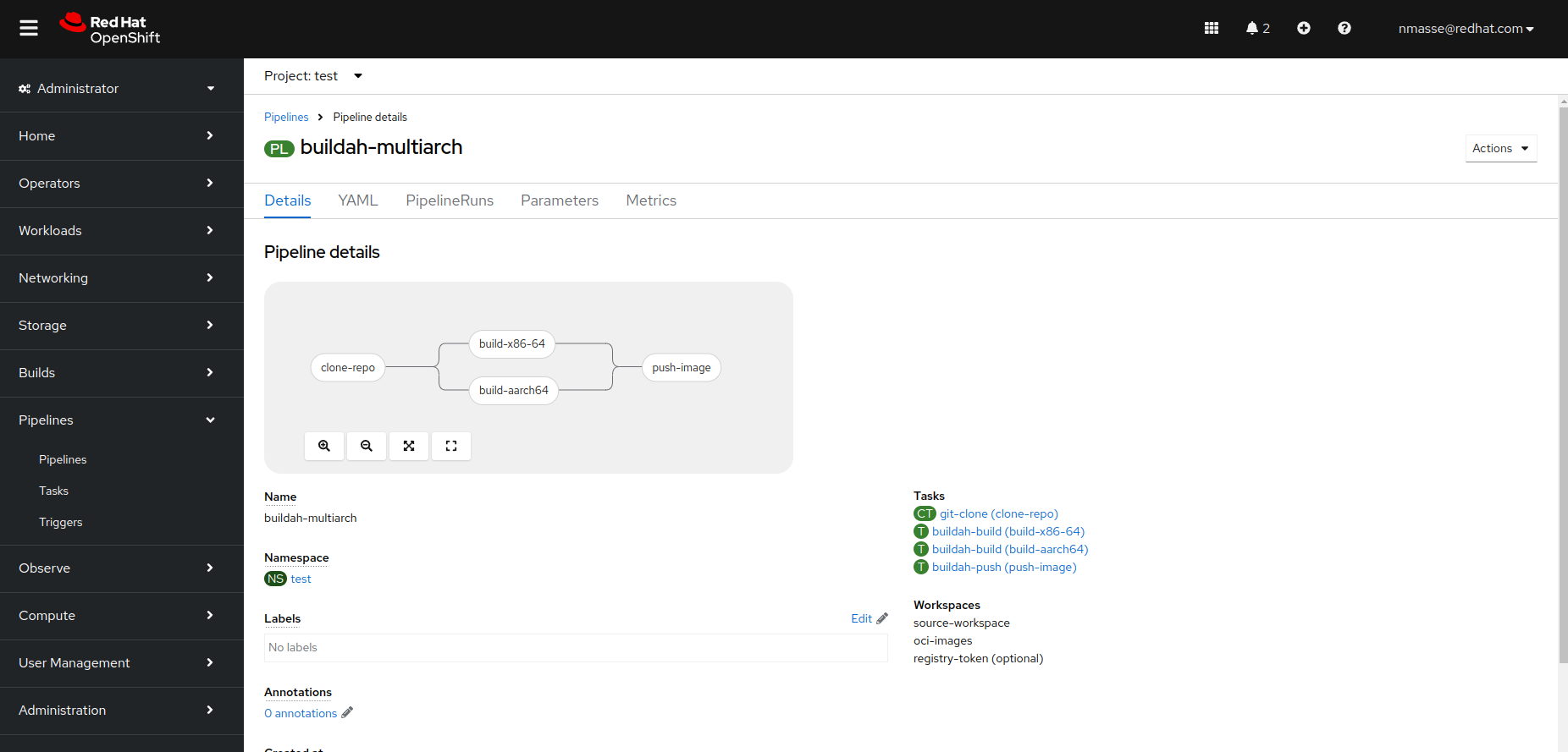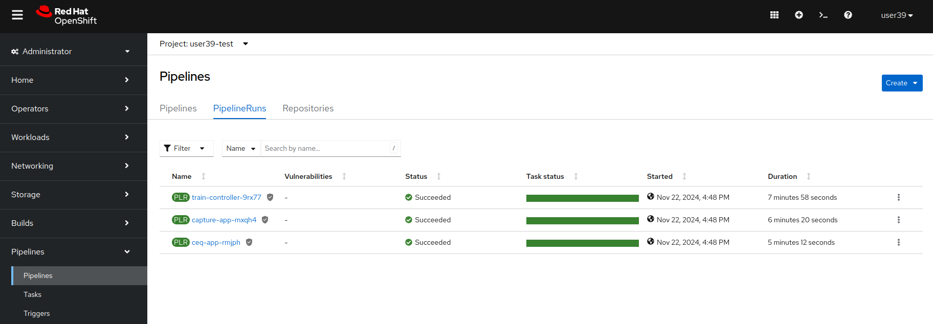 Open the OpenShift console and navigate to Administrator > Pipelines > Pipelines > PipelineRuns.