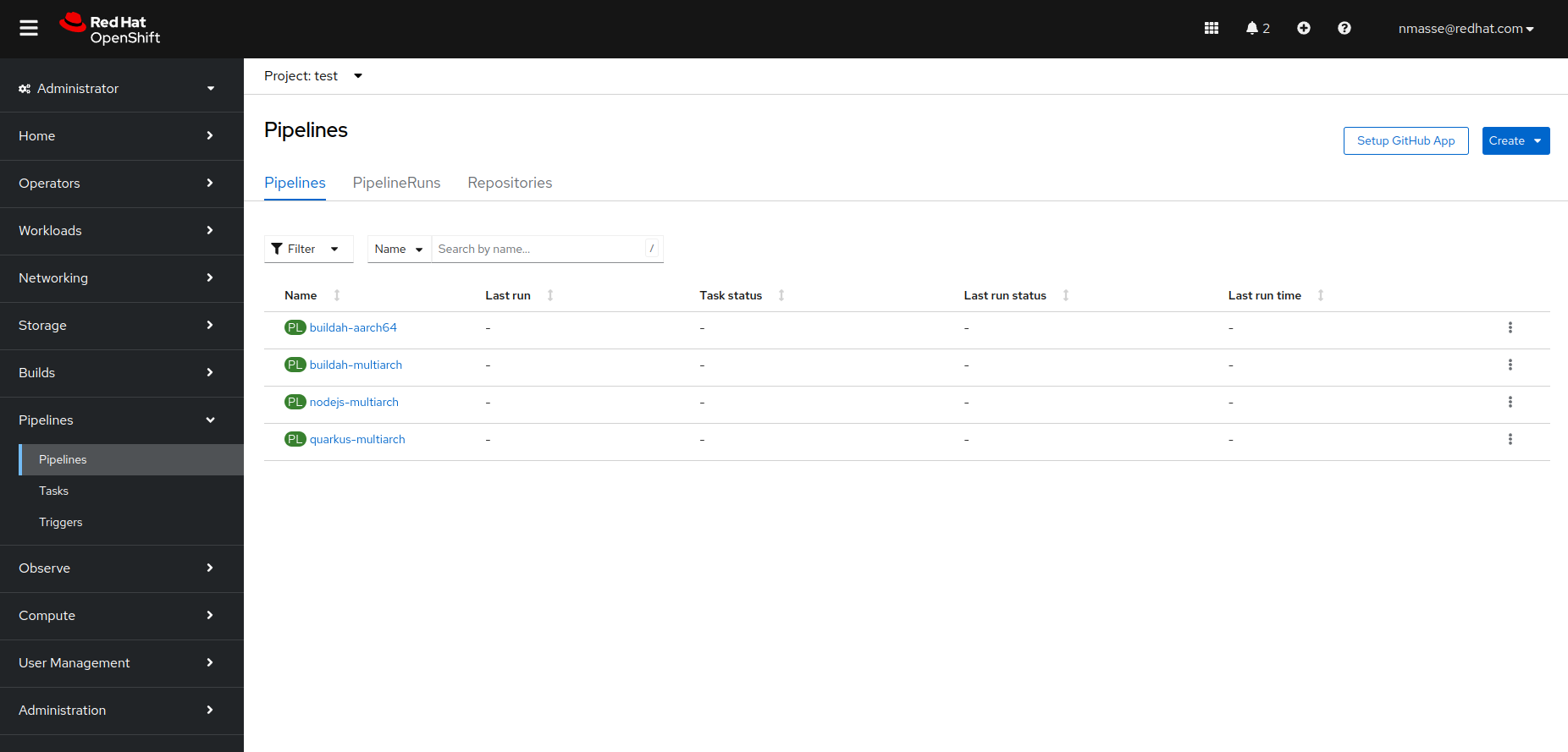 Open the OpenShift console and navigate to Administrator > Pipelines > Pipelines > Pipelines.